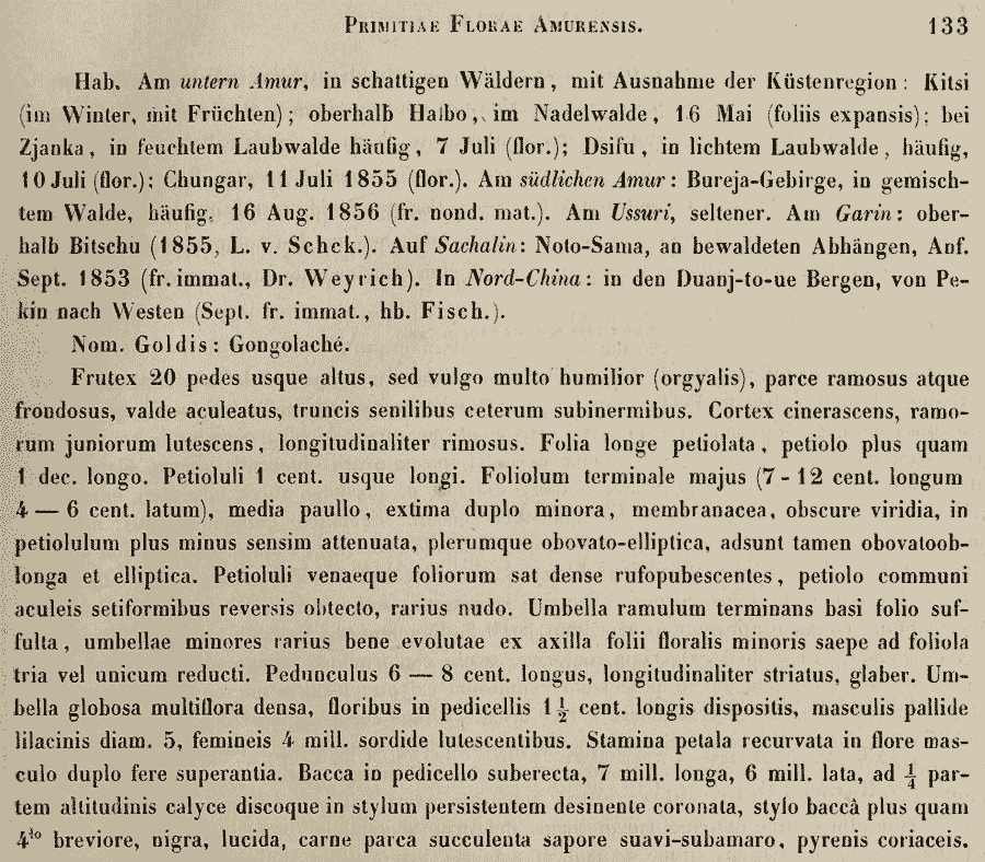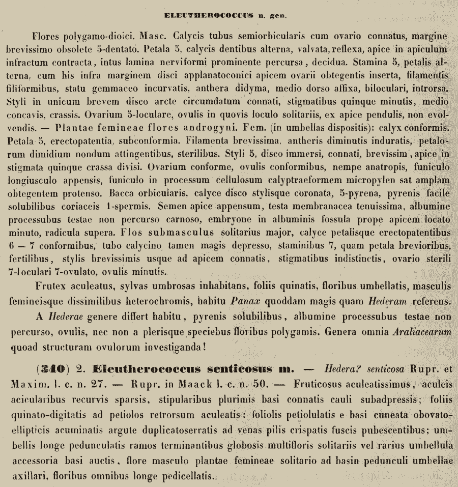 Протолог рода Eleutherococcus Maxim. (Mémoires présentés à l'Académie impériale des Sciences de St. Petersbourg par divers Savans et dans ses assemblées 9 (Primitiae Florae Amurensis): 132. 1859; тип: Eleutherococcus senticosus (Rupr.) Maxim. (≡ Hedera senticosa Rupr. ex Maxim.: