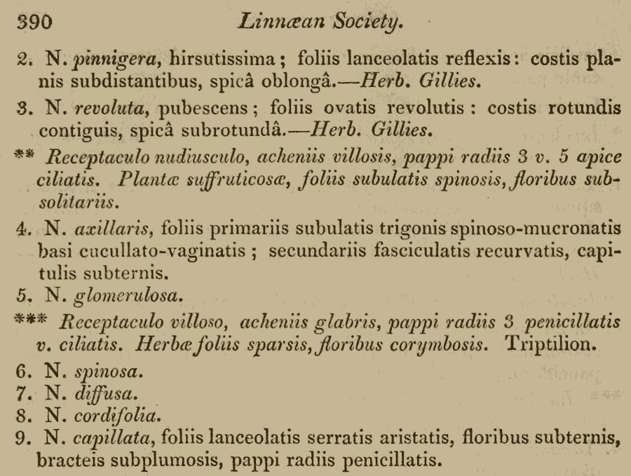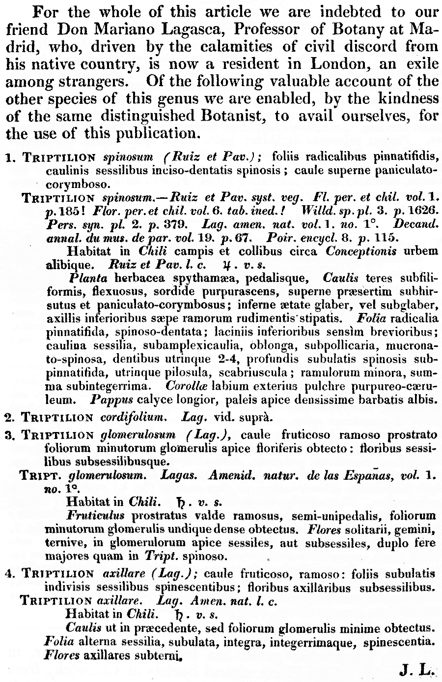 | Андрей Ковальчук | Если верить информации из IPNI и Tropicos, комбинация Triptilion axillare первоначально была обнародована в 10-м томе "Botanical Register", вышедшем в свет в 1824 г, и лишь два года спустя - в 16-м издании "Systema Vegetabilium". Таким образом, авторство во всех комбинациях следует исправить с Lag. ex Spreng. на Lag. ex Lindl. |