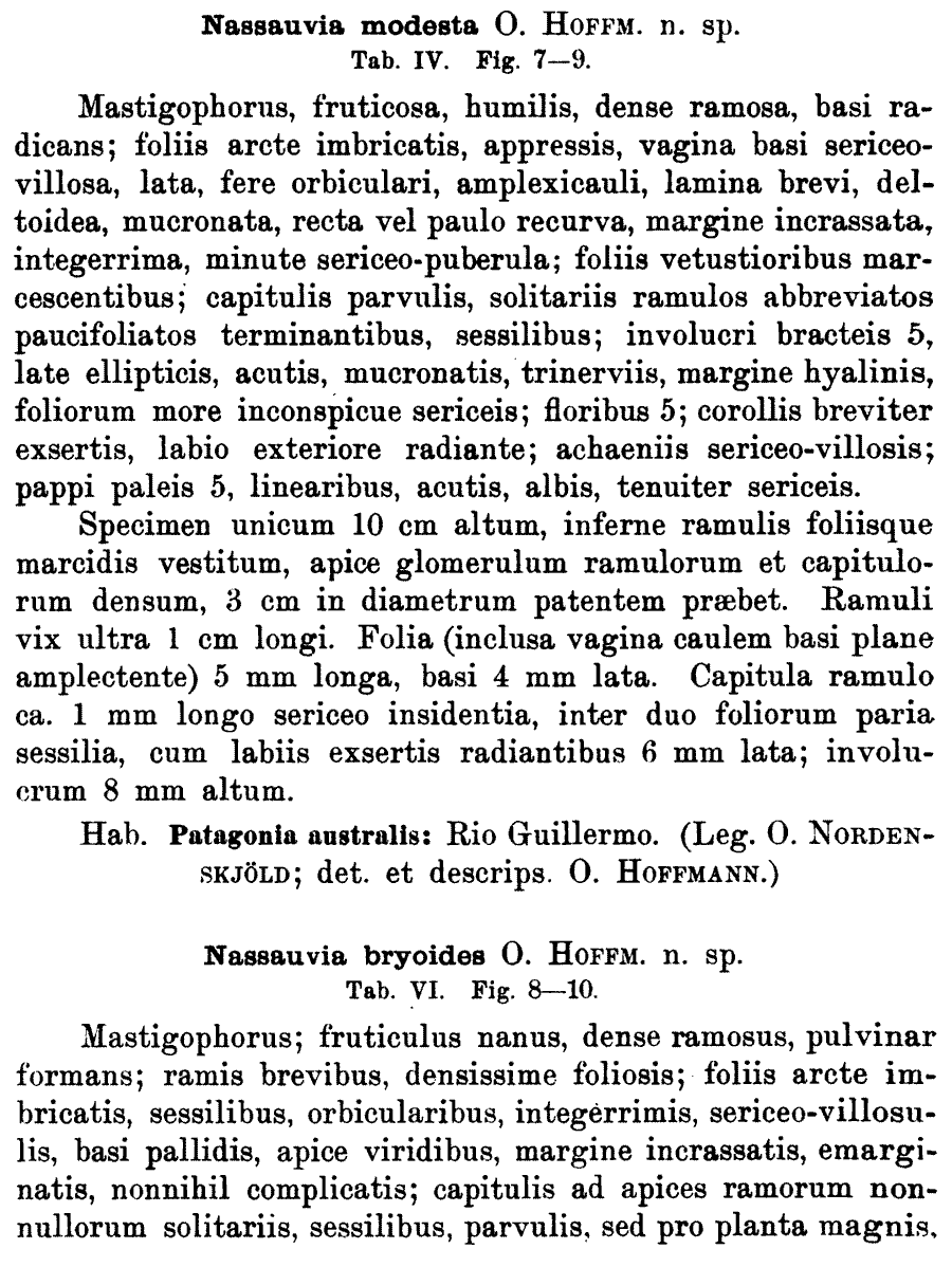 | Андрей Ковальчук | Протолог Nassauvia modesta O. Hoffm. и Nassauvia bryoides O. Hoffm. (Wissenschaftliche Ergebnisse der Schwedischen Expedition nach den Magellansländern 3, pt. 5: 114. 1900):