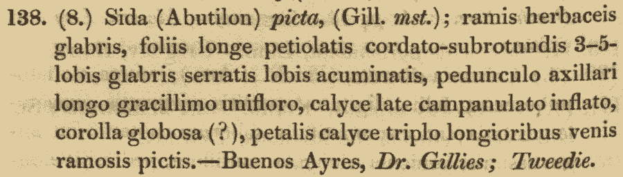 Протолог Sida picta Gillies ex Hook. & Arn. (Botanical Miscellany 3(8): 154. 1833 [1 Mar 1833]):