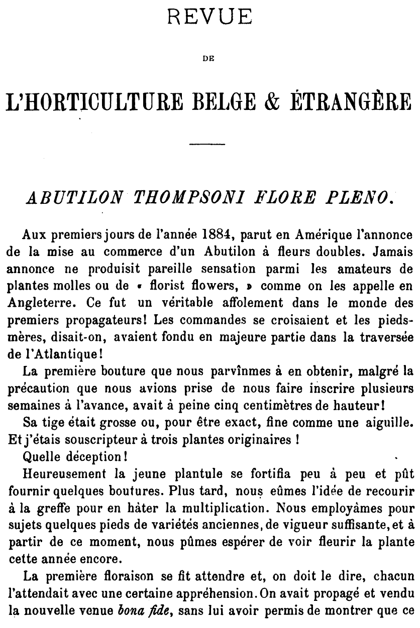 В IPNI и Tropicos приводится также комбинация Abutilon thompsonii André (Revue de l'Horticulture Belge et Étrangère 11: 7, pl. 1. 1885), однако довольно сомнительно, что эта комбинация является приоритетной, т.к. уже в 1870-х гг. это название довольно часто встречалось в литературе. На всякий случай - соответствующий фрагмент с иллюстрацией: