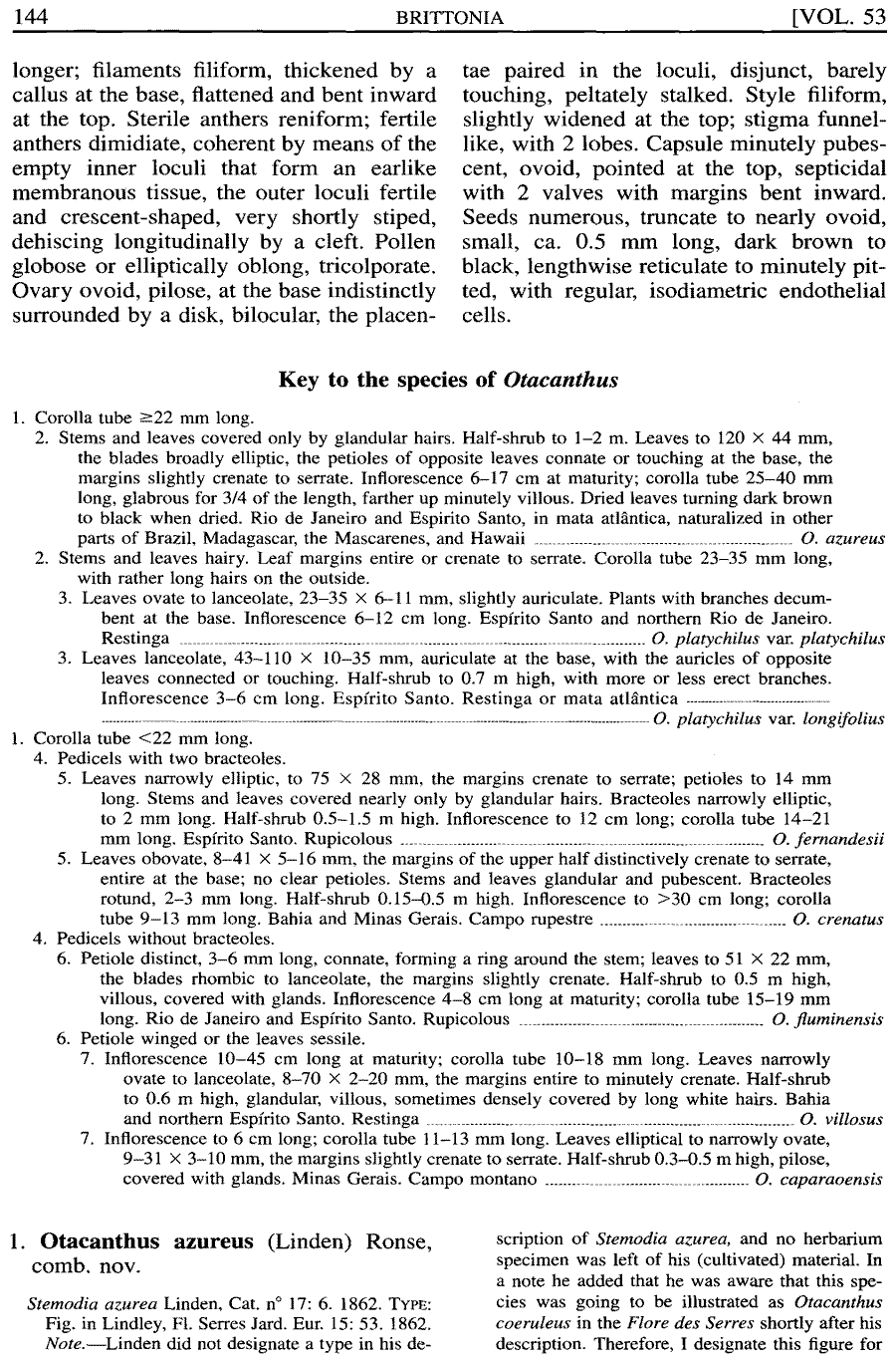 Лектотипом этого таксона была выбрана иллюстрация Otacanthus coerules Lindl. (Flore des Serres et des Jardins de l'Europe 15: 53, t. 1526. 1862; designated by Ronse in Brittonia 53(1): 144. 2001) (см. ниже). |