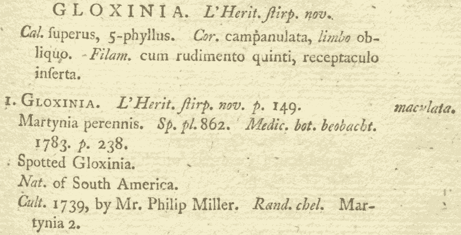 Род назван в честь немецкого ботаника и врача Беньямина Петера Глоксина (Benjamin Peter Gloxin, 1765 — 1794):