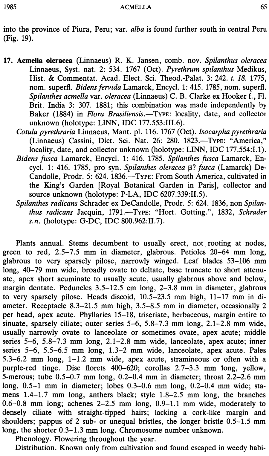| Андрей Ковальчук | Обнародование комбинации Acmella oleracea (L.) R. K. Jansen (Systematic Botany Monographs 8: 65. 1985):