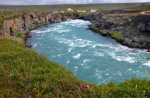 | Марина Скотникова | От озера Миватн мы поехали дальше на запад, в сторону Акюрейри – самого крупного города Северной Исландии. По пути мы увидели еще один потрясающе красивый водопад – Годафосс. Это самый часто посещаемый водопад Северной Исландии, т.к. помимо красоты и удобного расположения (практически у дороги, так что народу – тьма!), это еще и исторические место: после принятия исландцами христианства в 1000-х годах туда были сброшены языческие идолы.
