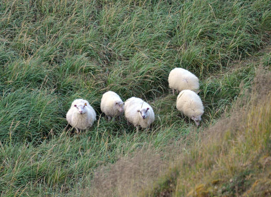 | Марина Скотникова | Ближе к вечеру мы приехали на северо-западное побережье, на мыс Ватснес. Здесь у кромки воды возвышается 15-метровая скала Хвитсеркур, а в высокой траве конечно же скрываются овцы