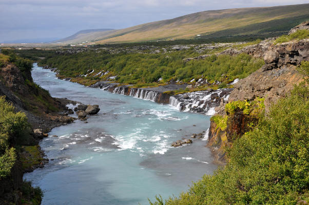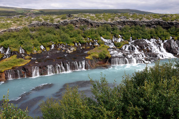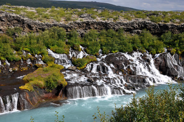 | Марина Скотникова | Из-под этого лавового поля просачиваются многочисленные ручьи, которые образуют серию небольших водопадов Хрёйнфоссар на реке Квитау. К этому моменту мы уже видели столько водопадов, что вроде бы не должны были удивляться, но все равно оказались просто поражены красотой этого места!