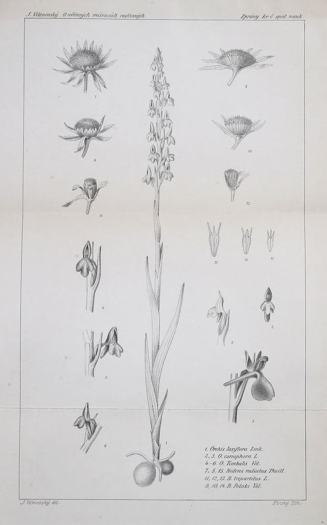 | Дмитрий Бочков | Оригинальная иллюстрация Й. Веленовского A. laxiflora (1), A. coriophora (2,3) и A. × timbalii (4,5,6), сопровождающая диагноз гибрида: