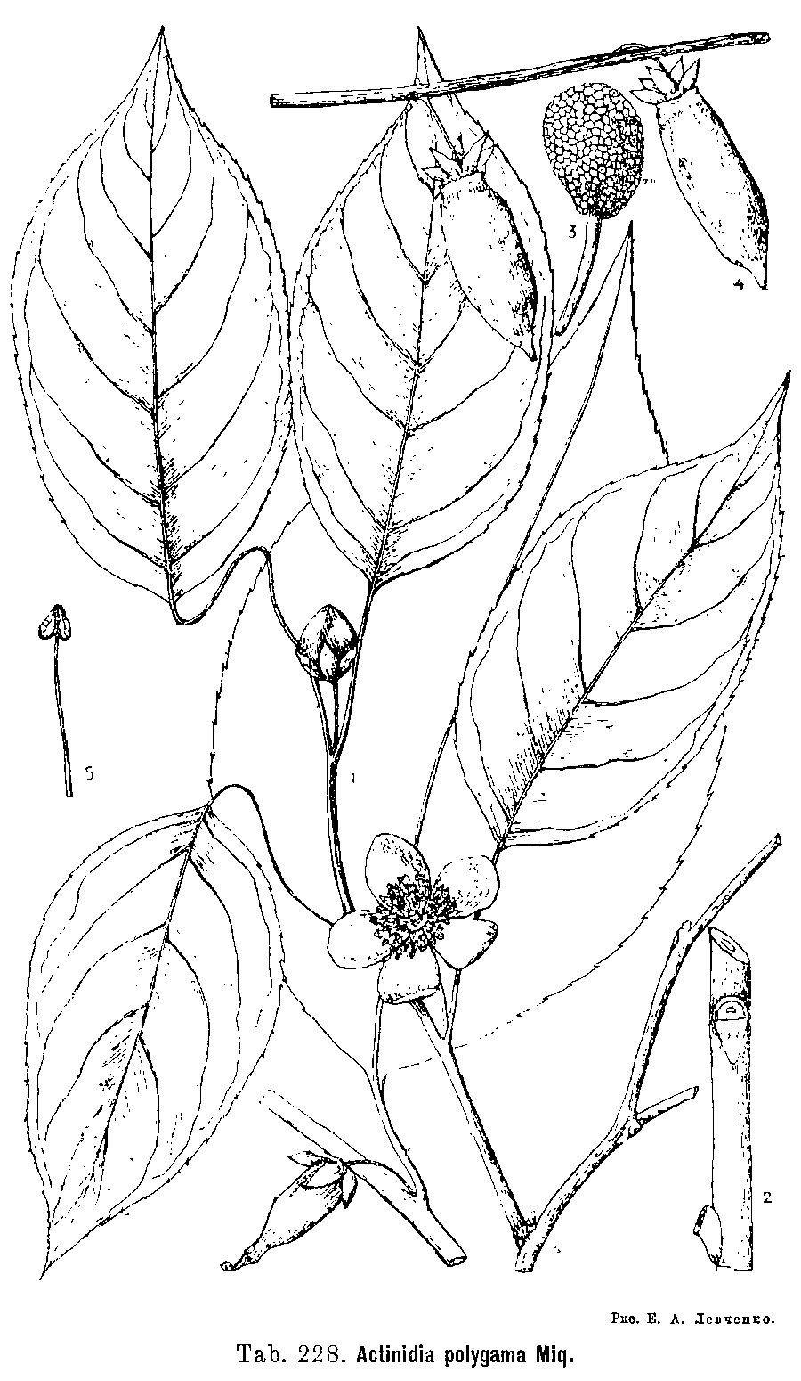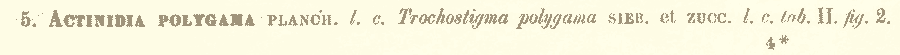 | Андрей Ковальчук | В отечественной литературе авторство этой комбинации обычно приводится как Actinidia polygama (Siebold & Zucc.) Maxim. (Mémoires Presentes a l'Académie Impériale des Sciences de St.-Pétersbourg par Divers Savans et lus dans ses Assemblées 9 (Primitiae Florae Amurensis): 64. 1859). Если считать, что комбинация была действительно обнародована в данном фрагменте, то приоритет должен быть за Максимовичем: