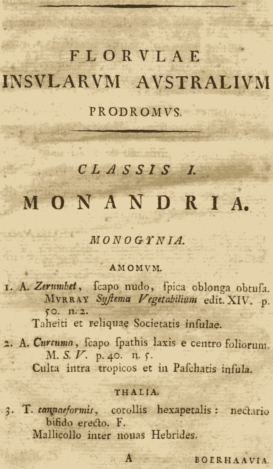 Протолог Thalia canniformis G. Forst. (Florulae Insularum Australium Prodromus 1. 1786):