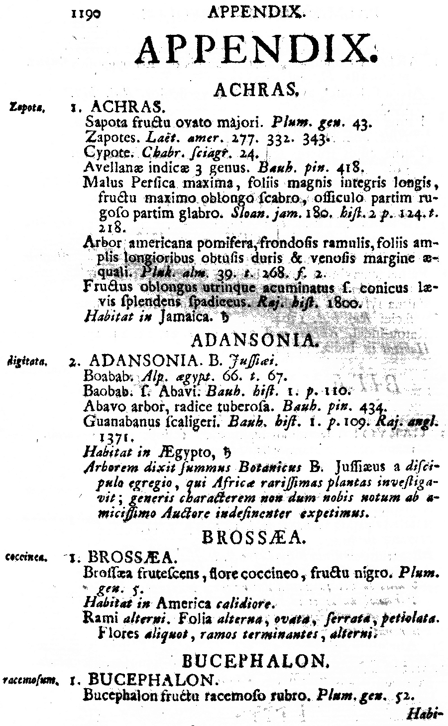 | Андрей Ковальчук | Хотя описание Adansonia digitata L. было опубликовано в 1-м издании "Species Plantarum" (Species Plantarum 2: 1190. 1753 [1 May 1753]), из-за номенклатруных нюансов (род Adansonia не был упомянут в издании "Genera Plantarum" 1754 г.), местом его действительного обнародования считается 12-е издание "Systema Naturae".
