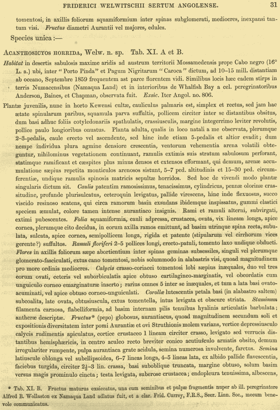 Протолог Acanthosicyos horridus Welw. ex Benth. & Hook.f. (Genera Plantarum [Bentham & Hooker f.] 1(3): 824. 1867 [Sep 1867]; тип: Acanthosicyos horridus Welw. ex Benth. & Hook.f.):