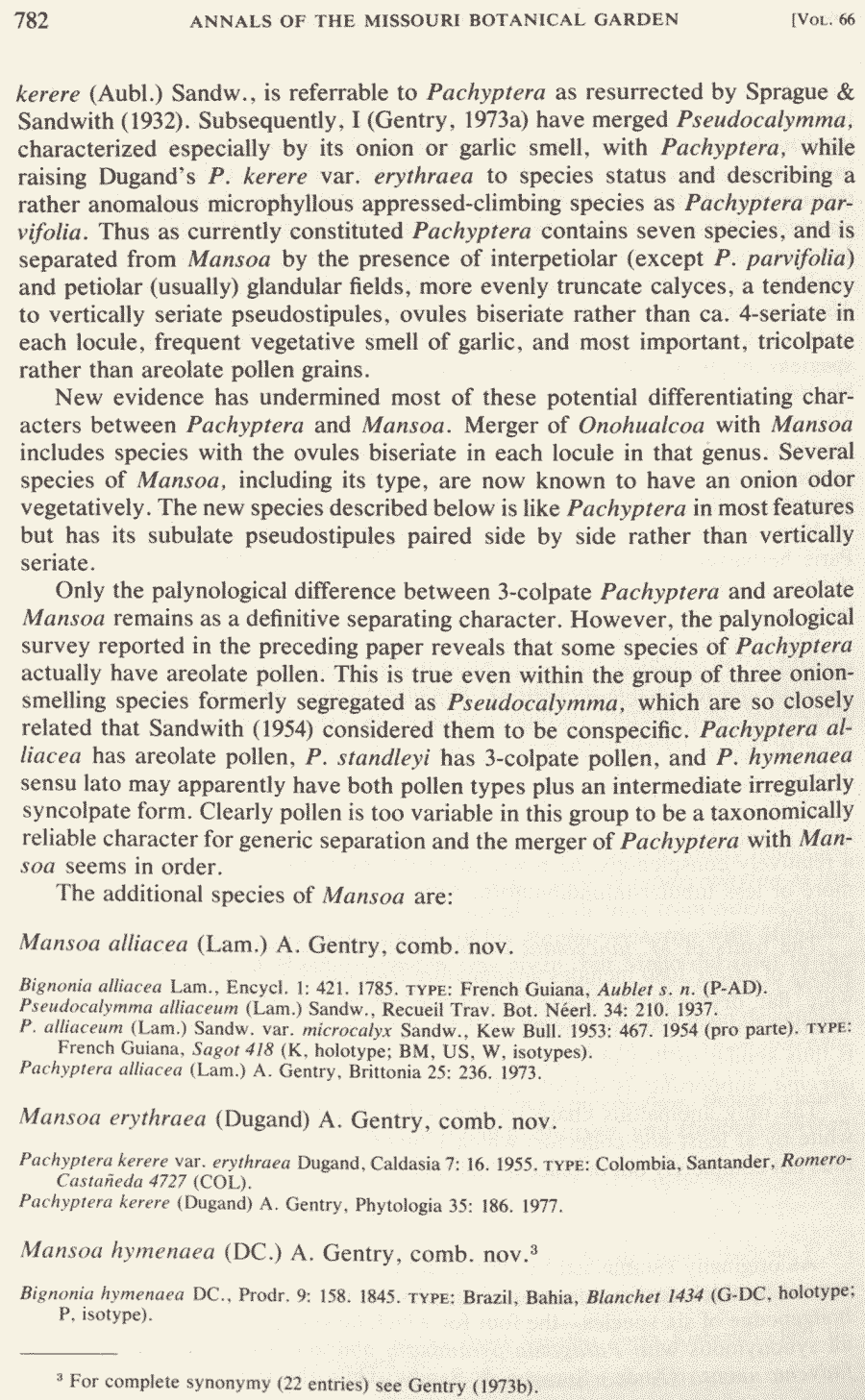 | Андрей Ковальчук | Обнародование комбинации Mansoa alliacea (Lam.) A.H. Gentry (Annals of the Missouri Botanical Garden 66(4): 782. 1979[1980]):