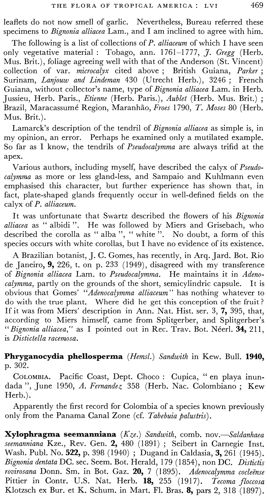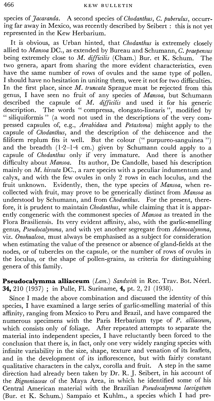 Pseudocalymma alliaceum var. macrocalyx Sandwith относят к синонимам Mansoa standleyi (Steyerm.) A.H. Gentry.