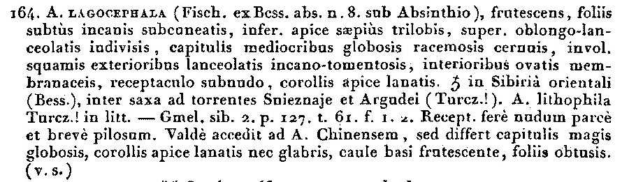 | Андрей Ковальчук | Обнародование комбинации Artemisia lagocephala (Fisch. ex Besser) DC. (Prodromus Systematis Naturalis Regni Vegetabilis 6: 122. 1838 [early Jan 1838]):