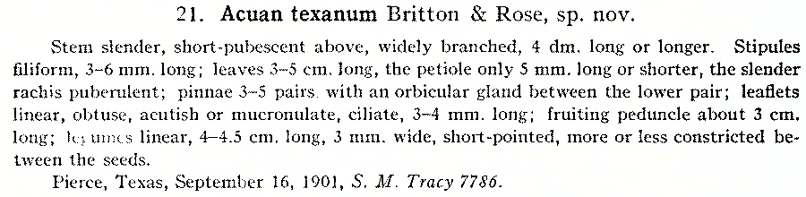 Типовой гербарный образец (голотип) Acuan texanum Britton & Rose: http://sweetgum.nybg.org/science/vh/specimen-details/?irn=704597 Протолог Acuan texanum Britton & Rose (North American Flora 23(2): 136. 1928):