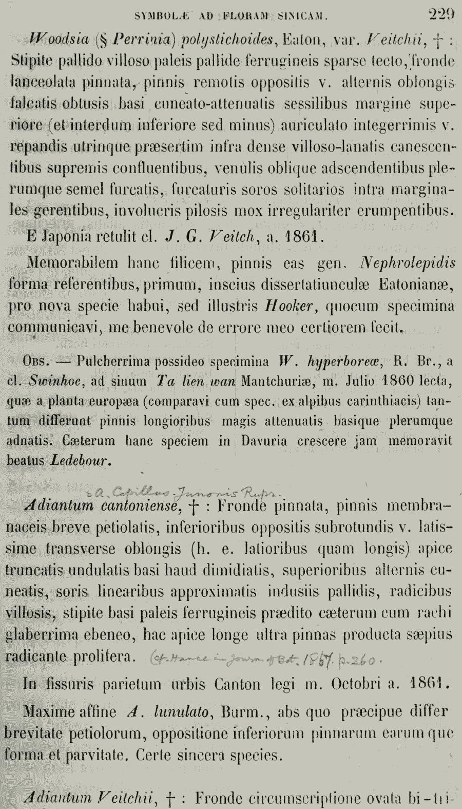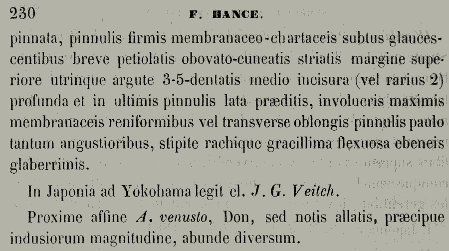 Протолог Adiantum veitchii Hance (Annales des Sciences Naturelles; Botanique, série 4, 15: 229–230. 1861):