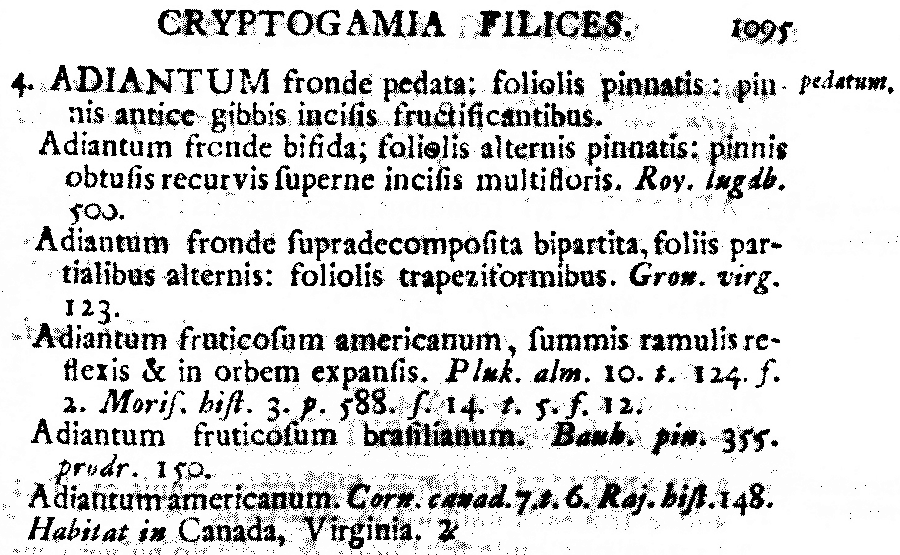 Лектотип Adiantum pedatum L. ("Adianthum fruticos. American. summis ramulis reflexis et in orbem expansis" in Plukenet, Phytographia, t. 124, f. 2, 1692 (Typotype: Herb. Sloane 93: 10 (BM-SLBig smile image; designated by Reveal in Jarvis (ed.), Order out of Chaos: 262 (2007Big smile image: Протолог Adiantum pedatum L. (Species Plantarum 2: 1095. 1753 [1 May 1753]):