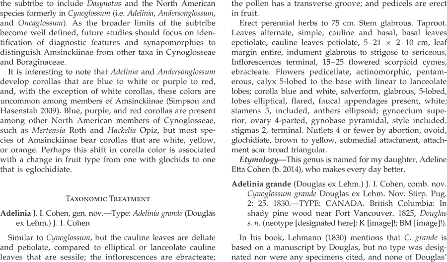 Род назван в честь дочери первоописателя рода, Аделины Коэн (Adeline Etta Cohen; род. 2014).