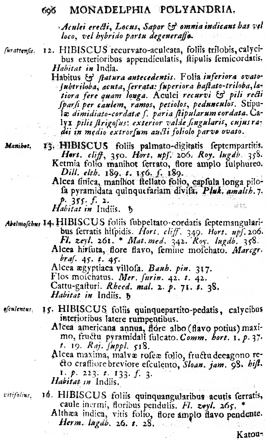 Протолог Hibiscus manihot L. (Species Plantarum 2: 696. 1753 [1 May 1753]):