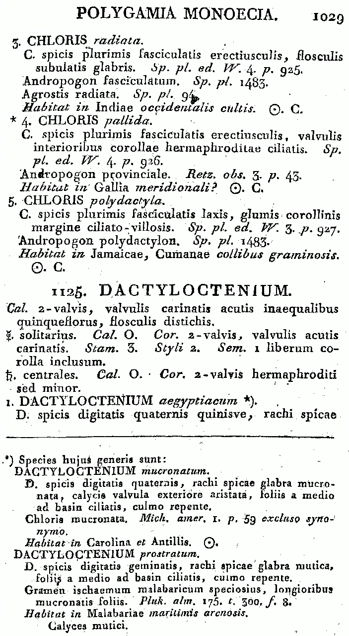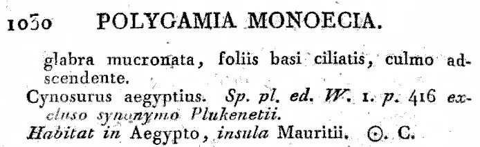 Протолог рода Dactyloctenium Willd. (Enumeratio Plantarum Horti Botanici Berolinensis [Willdenow] 2: 1029. 1809; лектотип: Dactyloctenium aegyptium (L.) Willd. (≡ Cynosurus aegyptius L.), designated by Hitchcock, A. S. 1920. The genera of grasses of the United States. U.S.D.A. Bull. (1915-23) 772: 175):