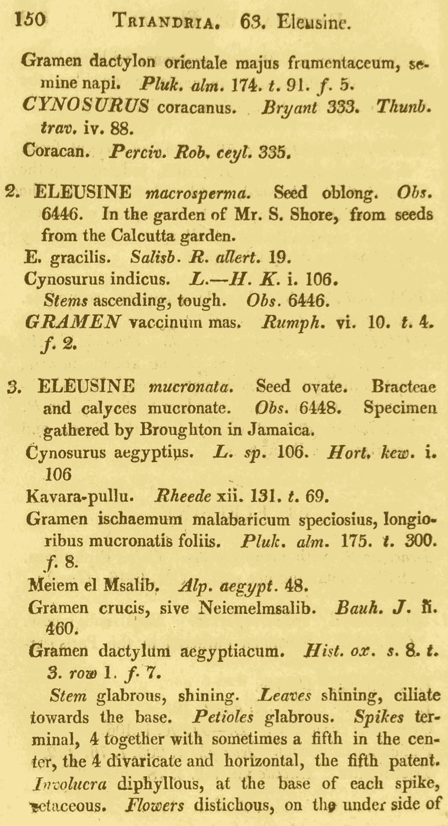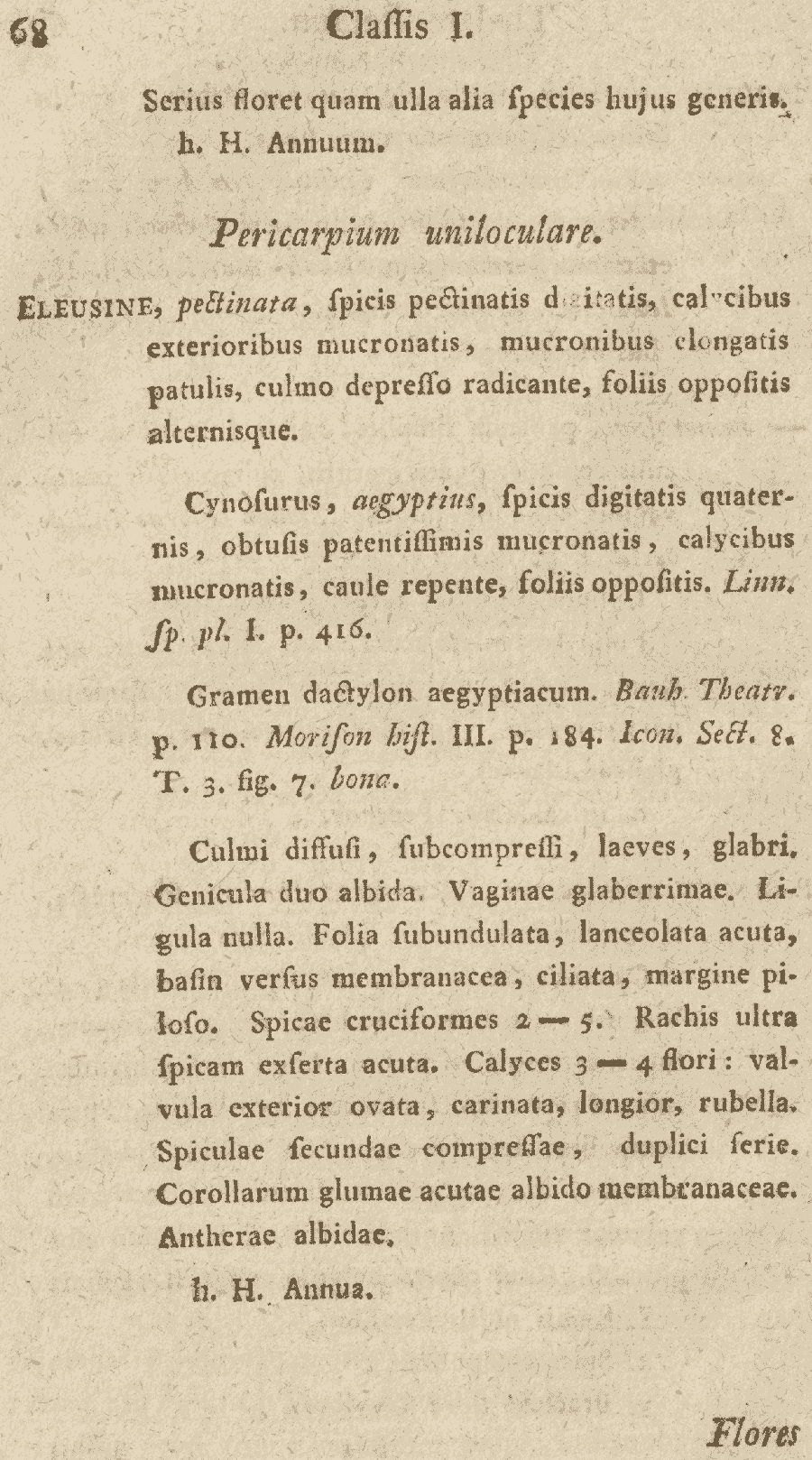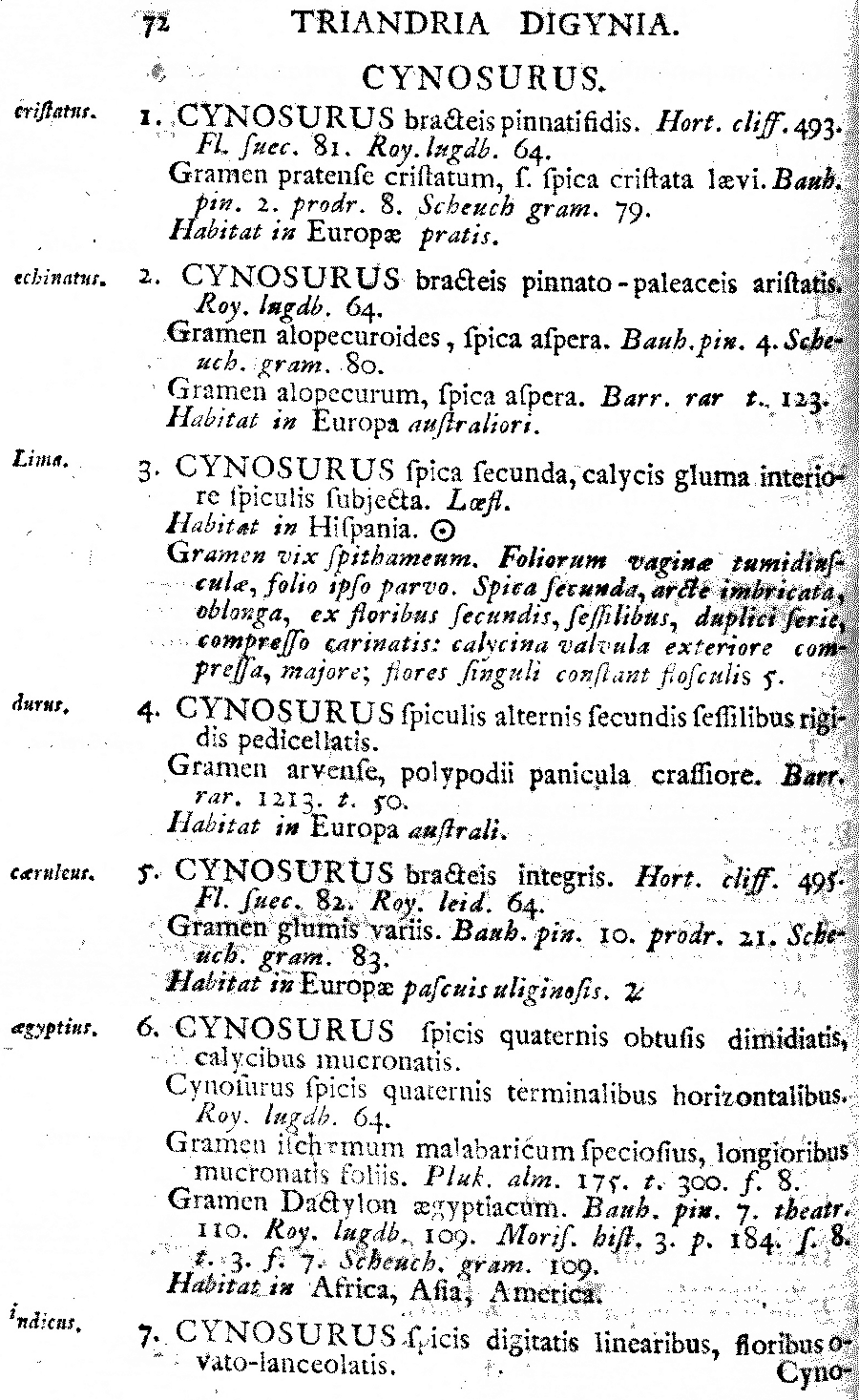 Протолог Cynosurus aegyptius L. (Species Plantarum 1: 72. 1753 [1 May 1753]):