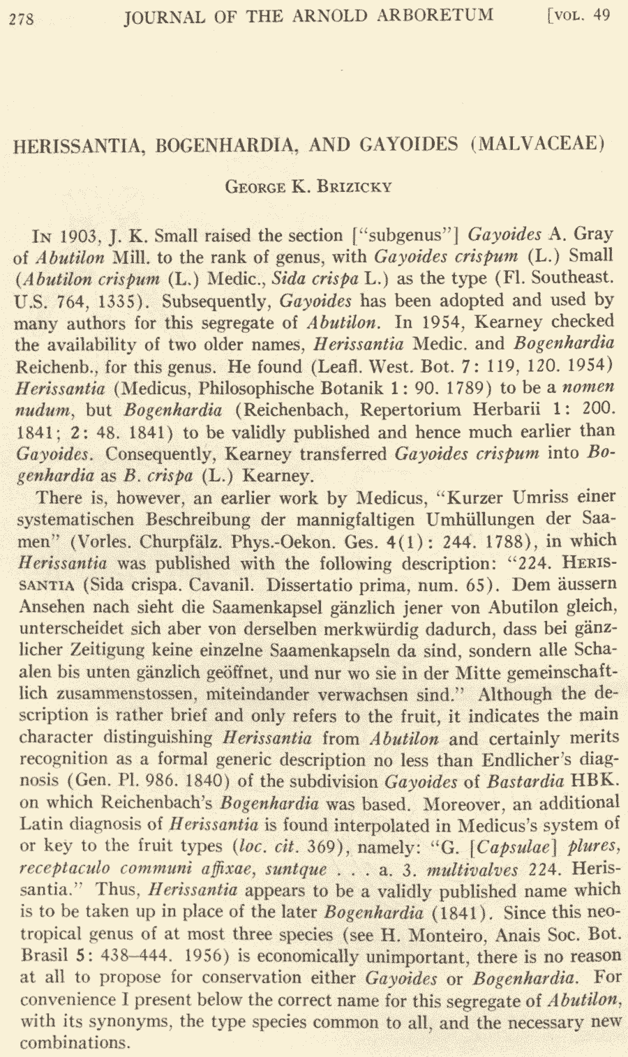 | Андрей Ковальчук | Обнародование комбинации Herissantia crispa (L.) Brizicky (Journal of the Arnold Arboretum 49(2): 279. 1968):