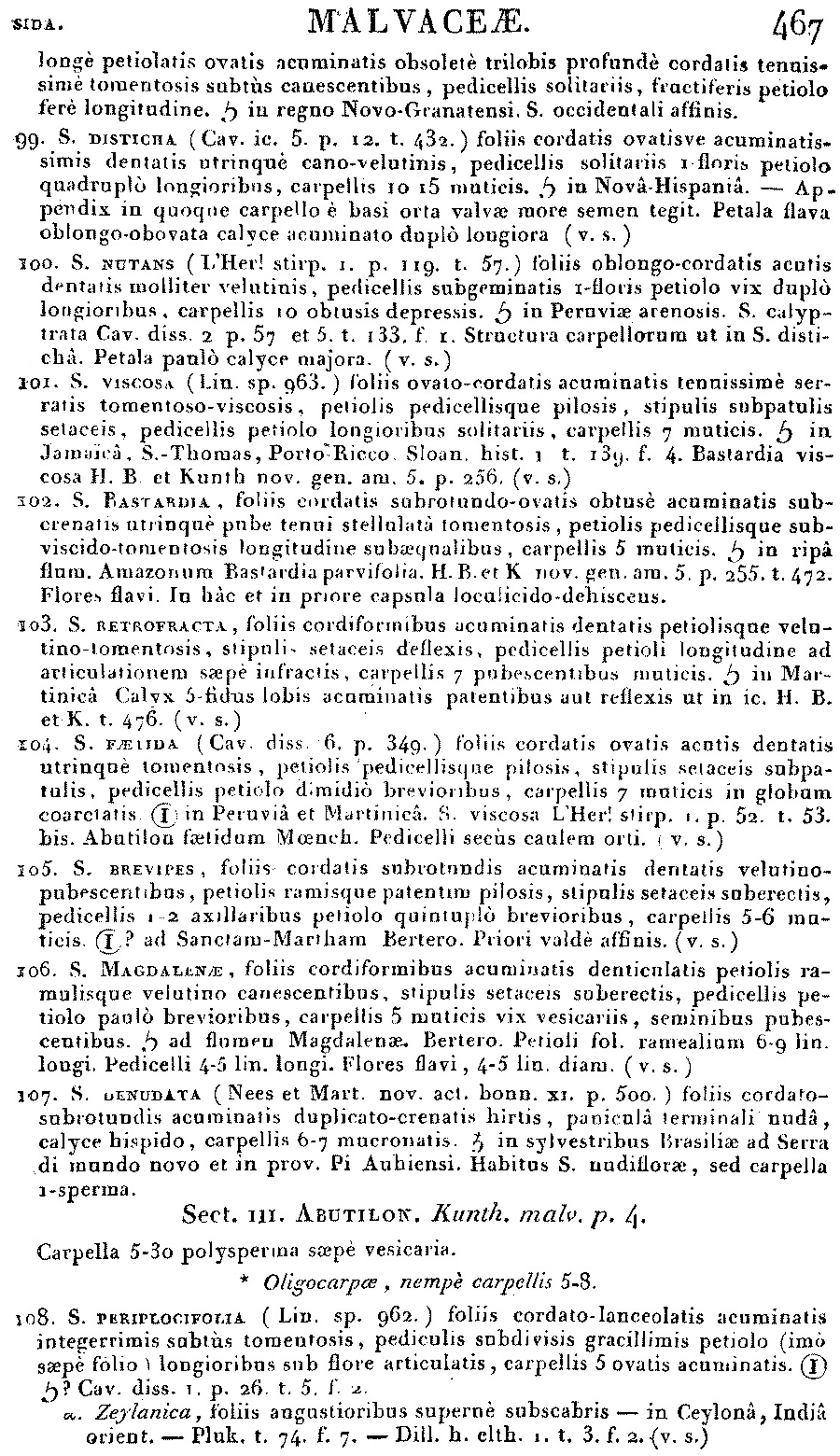 1) комбинация Abutilon sessiliflorum C. Presl не была опубликована, это лишь ошибочная форма Abutilon sessilifolium C. Presl. Предлагаю либо убрать её совсем, либо заменить на Abutilon sessiliflorum auct.