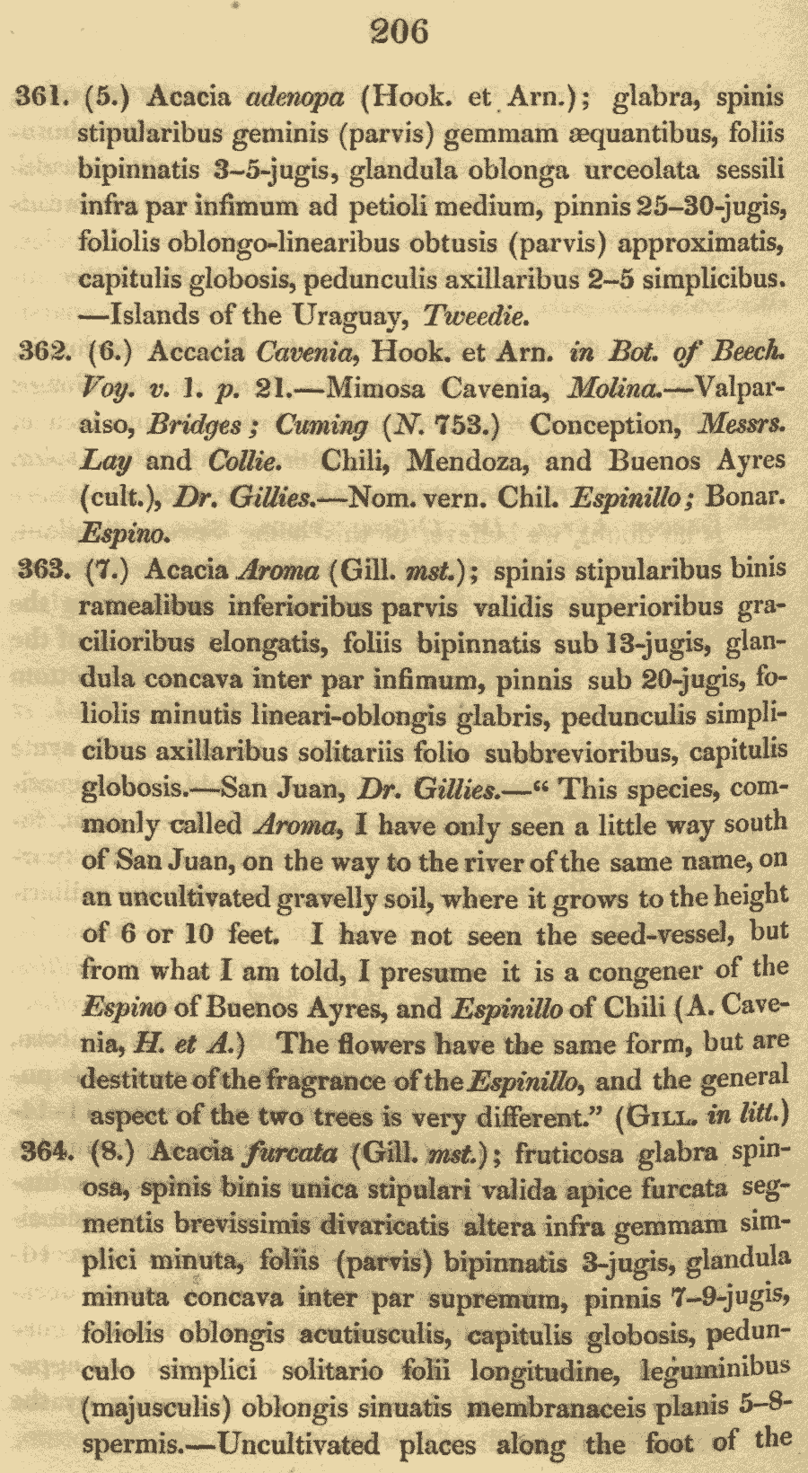 Протолог Acacia aroma Gillies ex Hook. & Arn. (Botanical Miscellany 3(8): 206. 1833):
