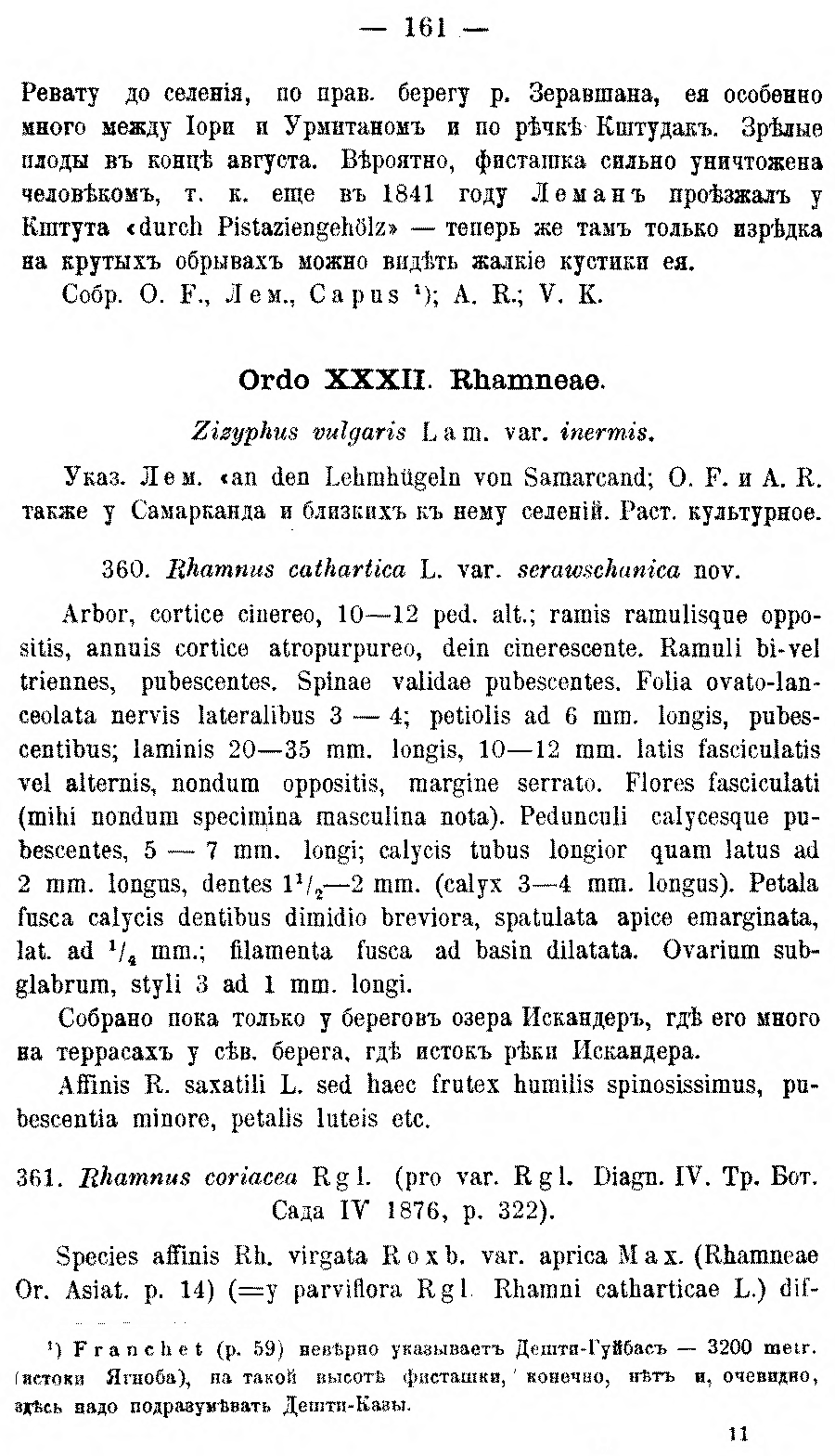 | Андрей Ковальчук | Очевидно, что название Rhamnus coriacea (Regel) Kom. незаконно. Что с ним делать, не совсем понятно. В ОРСА эта группа нарезана гораздо более крупно, чем у Черепанова или во "Флоре СССР", и, если выбирать из списка синонимов в ОРСА, то, похоже, приоритетным в ранге вида будет название R. songorica. С другой стороны, обработке в ОРСА уже больше 35 лет, но ничего более актуального по среднеазиатским видам Rhamnus я с ходу не нашёл. Возможно, что-то прояснится, когда до этой группы доберутся в новой "Флоре Узбекистана". Если не найдётся никакого решения, можно, на крайний случай, просто оставить всё как есть. |