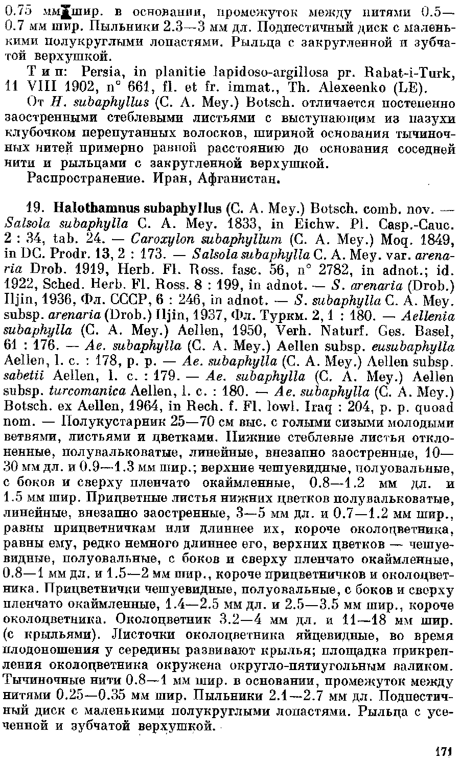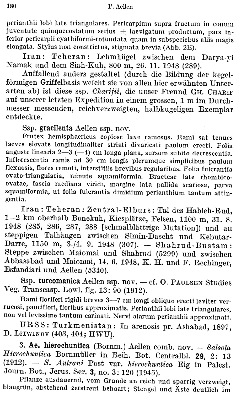 Обнародование комбинаций Aellenia subaphylla ssp. eusubaphylla Aellen (Verhandlungen der Naturforschenden Gesellschaft in Basel 61: 178. 1950) и Aellenia subaphylla ssp. turcomanica Aellen (Verhandlungen der Naturforschenden Gesellschaft in Basel 61: 180. 1950):