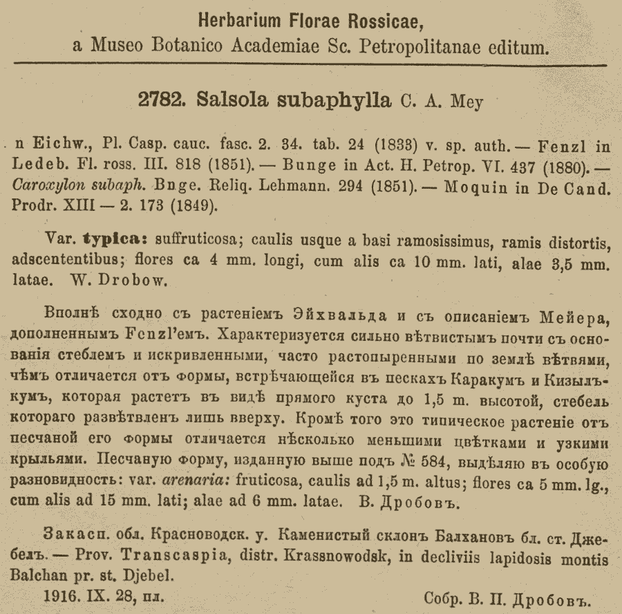 Протолог Salsola subaphylla var. arenaria Drobow и Salsola subaphylla var. typica Drobow (Herbarium Florae Rossicae 56: 2782. 1919):