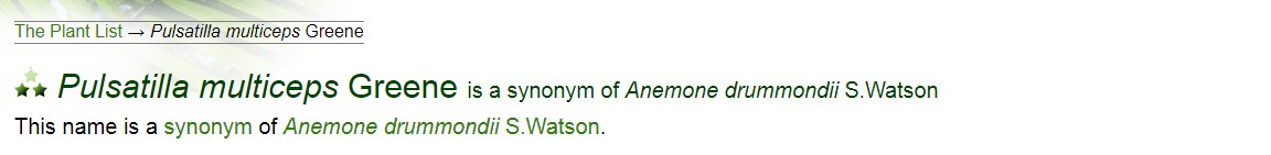 нет "прямого и ясного указания", что имя Pulsatilla multiceps является синонимом | | Юрий Постников | «Pulsatilla multiceps Greene is a synonym of Anemone drummondii S.Watson» http://www.plantlist.org/tpl1.1/record/tro-27102594 «…original publication details: Erythea 1(1): 4 1893. Full publication details for this name can be found in IPNI: http://ipni.org/urn:lsid:ipni.org:names:214465-2 »