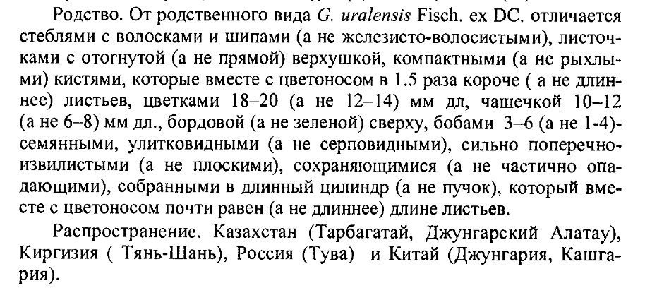 Родство. От родственного вида С. uralensis Fisch ex DC. отличается стеблями с волосками и шипами (а не железисто-волосистыми), листочками с отогнутой (а не прямой) верхушкой, компактными (а не рыхлыми) кистями, которые вместе с цветоносом в 1.5 раза короче ( а не длиннее) листьев, цветками 18 — 20 (а не 12 — 14) мм дл, чашечкой 10 — 12 (а не 6 — 8) мм дл., бордовой (а не зеленой) сверху, бобами 3 — 6 (а не 1-4)- семянными, улитковидными (а не серповидными), сильно поперечноизвилистыми (а не плоскими), сохраняющимися (а не частично опадающими), собранными в длинный цилиндр (а не пучок), который вместе с цветоносом почти равен (а не длиннее) длине листьев.