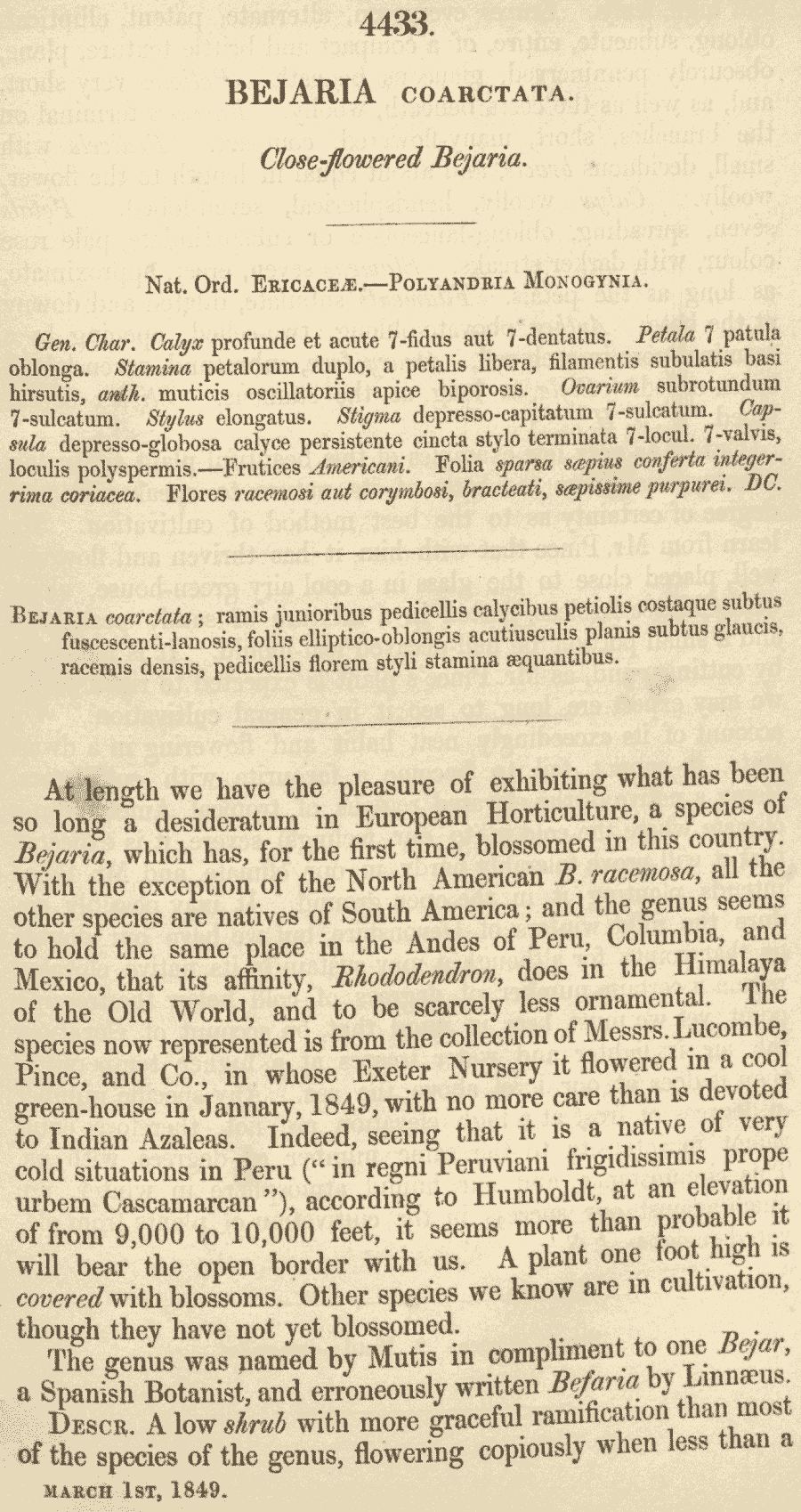 Типовой гербарный образец (голотип) Bejaria mexicana Benth.: http://specimens.kew.org/herbarium/K000494366 Протолог Bejaria mexicana Benth. (Plantas Hartwegianas imprimis Mexicanas: 15. 1839):
