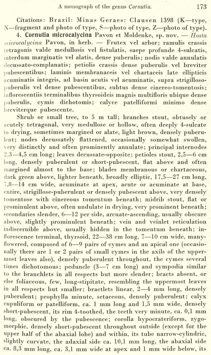 Протолог Cornutia microcalycina Pav. ex Moldenke (Repertorium Specierum Novarum Regni Vegetabilis 40(11–19): 173. 1936 [30 Jun 1936]):