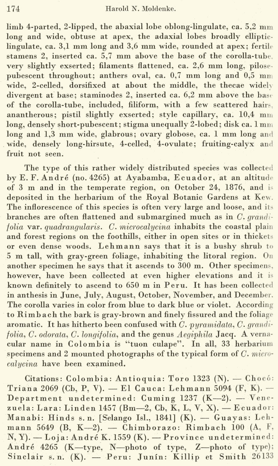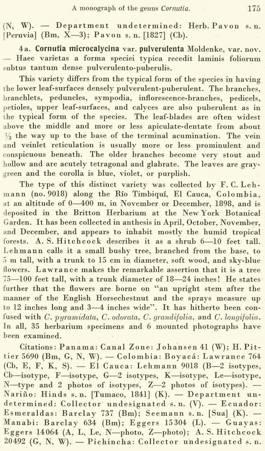 | Андрей Ковальчук | Протолог Cornutia microcalycina var. pulverulenta Moldenke (Repertorium Specierum Novarum Regni Vegetabilis 40(11–19): 175. 1936 [30 Jun 1936]) и Cornutia microcalycina var. anomala Moldenke (Repertorium Specierum Novarum Regni Vegetabilis 40(11–19): 176. 1936 [30 Jun 1936]):