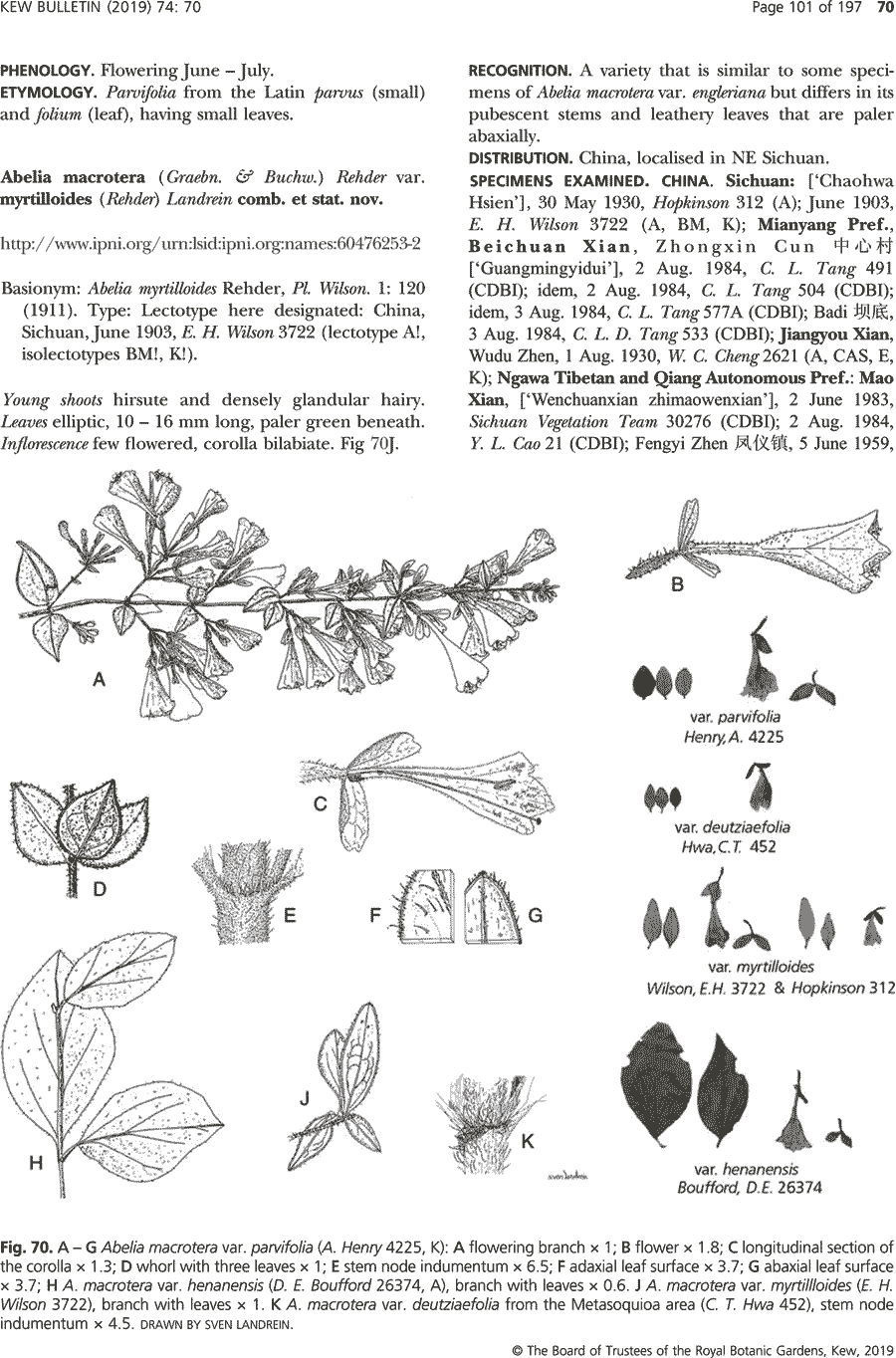 | Андрей Ковальчук | Обнародование комбинации Abelia macrotera var. myrtilloides (Rehder) Landrein (Kew Bulletin 74(4)-70: 101. 2019):