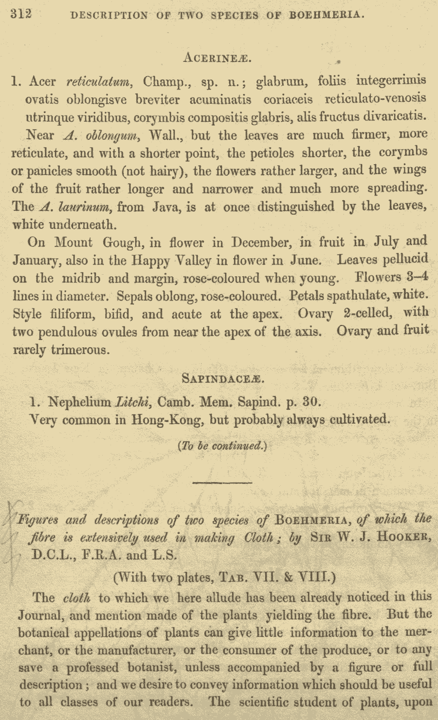 Протолог Acer reticulatum Champ. ex Benth. (Hooker's Journal of Botany and Kew Garden Miscellany 3: 312. 1851):