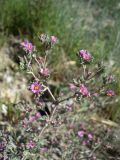 Ботаническое описаниеПолукустарник, сильно ветвистый, 35—40 см выс. с многочисленными простертыми ветвями, восходящими или прямыми (var. erecta Boiss.), узловатыми, редко голыми [laevls (L.) Boiss]. почти всегда слабо [var. intermedia (DC). Boiss.J или густо [var. hisplda (DC.) Boiss.] покрытыми короткими, белыми, одноклеточными, жесткими, прямыми волосками; л. линейные или продолговато линейные, 3—8 мм дл., 0.5—4 мм шир., островатые, с краями завороченными, покрытыми с нижней стороны редкими или густыми [var. hlspida (DC.) Boiss], короткими, белыми волосками, в основании суженные в маленький, 0.5—1 мм дл., ресничатый чрш. Цв. в щитках, 5—7 мм дл., 7—8 мм шир., пазушных и на концах ветвей; чшч. цилиндрическая, 4.5—5 мм дл., 1.5—1.8 мм шир., с 4—5 выдающимися ребрами и 5 зубцами, 1—1.5 мм дл., ланцетными, островатыми, иногда более удлиненными (var. erecta Boiss.), покрытая белыми короткими волосками или в верхней части голая (f. Meyeriana G. Woron.); лп. 5, пурпурово-розовые, обратно яйцевидные, мелко зубчатые, 6—7 мм дл., 2.5—3(4) мм шир., к основанию суженные в ноготки, 3 мм дл., с язычками, 3 мм дл.; тыч. 6; коробочка овальная или продолговато овальная, 2.5—3 мм дл., 4.5 мм шир. с 3 створками; с. очень мелкие, 0.3—0.5 мм дл., светлокоричневые, продолговатые, снизу острые. VI—VII. Прибрежные солончаки и солонцы, солончаки мокрые и пухлые, солончаковые пустыни и каменистые степи.—Еврон. Бесс., Причерн., Крым, Ниж.-Дон., Ниж.-Волж., Кавказ: Предкавк., Даг., Вост. и Южн. Закавк.; Зап. Сибирь: Верх.-Тоб., Ирт.; Ср. Азия: Арало-Касп., Прибалх., Кыз.-Кум., Кара-Кум., ГорнУГуркм.; Аму-Дар. (Каган); Сыр-Дар., Пам.-Ал., Тянь-Шан. Общ. распр.: Ср. Евр., Средиз., Арм.-Курд., Иран., сев. и южн. Африка. Описан из Европы. Тип в Лондоне. Источник: Флора СССР. — М.; Л.: Изд-во АН СССР, 1949, Т. 15. — С. 274 Указания в Красных книгах (12)Республика Башкортостан (2001) Республика Башкортостан (2011) Донецкая Народная Республика (2020) Краснодарский край (2017) Курганская область (2002) Курганская область (2012) Омская область (2015) Саратовская область (2006) Саратовская область (2021) Украина, Днепропетровская область (2010) Украина, Днепропетровская область (2011) Украина, Донецкая область (2010) Веб-ресурсыБотаническое описание | www.nsc.ruПожаловаться Подробное описание отдельных частей растения, его экологии, распространения и т.п. Ботаническое описание и фото | maltawildplants.comПожаловаться На англ. яз. Гербарий | plant.depo.msu.ruПожаловаться Сканы гербарных образцов (MW) Гербарий | herbariumle.ruПожаловаться Фотографии гербарных образцов Гербарий, описание | bg.sfedu.ruПожаловаться Краткое описание, биология, распространение. Скан гербарного экземпляра. Краткая информация и фото | flora.org.ilПожаловаться На англ. яз. Распространение | europlusmed.orgПожаловаться Рисунки | botanicalillustrations.orgПожаловаться Фото, гербарий, распространение | powo.science.kew.orgПожаловаться Фото, распространение | www.gbif.orgПожаловаться Ссылки для публикацийFrankenia hirsuta L. // Плантариум. Растения и лишайники России и сопредельных стран: открытый онлайн атлас и определитель растений. [Электронный ресурс] URL: https://www.plantarium.ru/page/view/item/16528.html (дата обращения: 18.01.2026). Frankenia hirsuta L. // Plantarium. Plants and lichens of Russia and neighboring countries: open online galleries and plant identification guide. URL: https://www.plantarium.ru/lang/en/page/view/item/16528.html (accessed on 18 Jan 2026). |